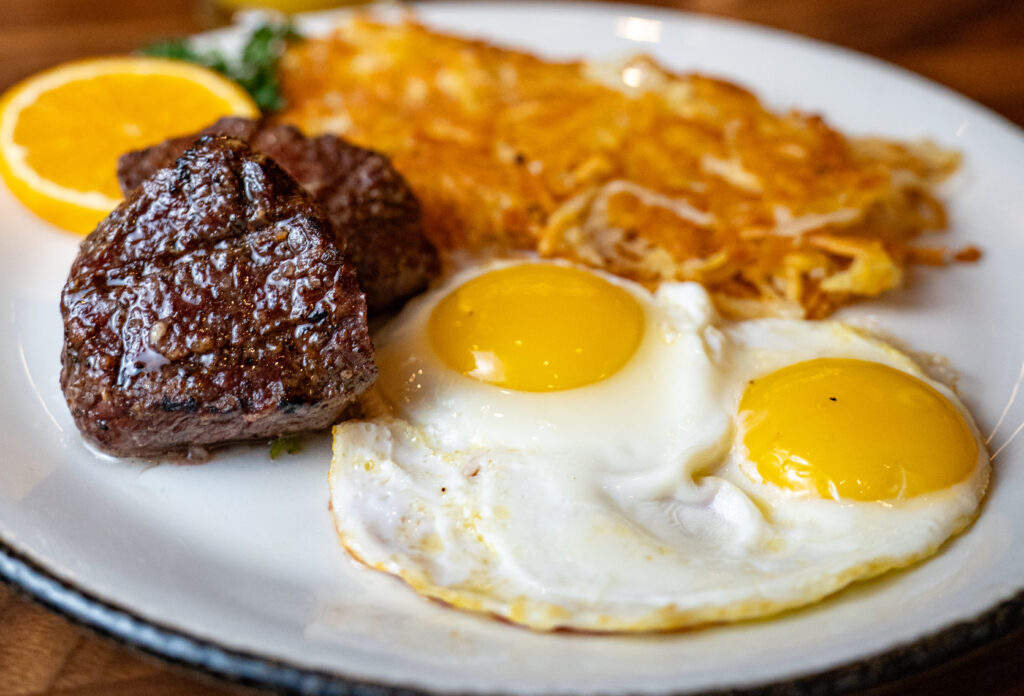 Grilled tender filets, 2 eggs any style, choice of country potatoes or hashbrowns, and 2 slices of toast.